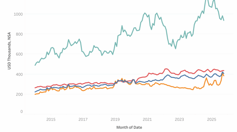 Mortgage activity rose sharply in October compared to last year as easing interest rates helped boost demand across the board. Even though total applications dipped month-over-month, they were up 39% from a year ago, with refinancing applications increasing 63% annually and purchase applications rising 18%. The average 30-year fixed rate fell to 6.37%, its lowest level in over a year, contributing to stronger year-over-year activity despite short-term declines.