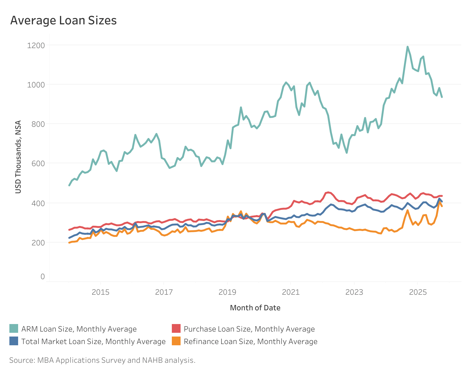 Adjustable-rate mortgages (ARMs) saw the most dramatic growth, with applications more than doubling from last year and reaching one of their highest market shares in three years. While average loan sizes decreased overall, purchase loan sizes held steady and ARM loan sizes, still much higher than fixed-rate loans, fell 5%. The trends suggest consumers are responding to lower rates and exploring more flexible financing options as the mortgage market continues to stabilize.
