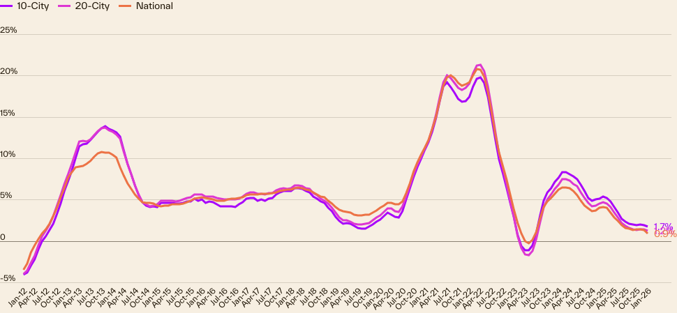 According to the S&P Cotality Case-Shiller Home Price Index, the leading measure of U.S. residential real estate prices, the beginning of 2026 is off to a colder start than predicted. Home price growth in January dipped to 0.9%, a 0.11% decrease for the month, a significant drop from the typical 0.03% seasonal dip reported in years before.