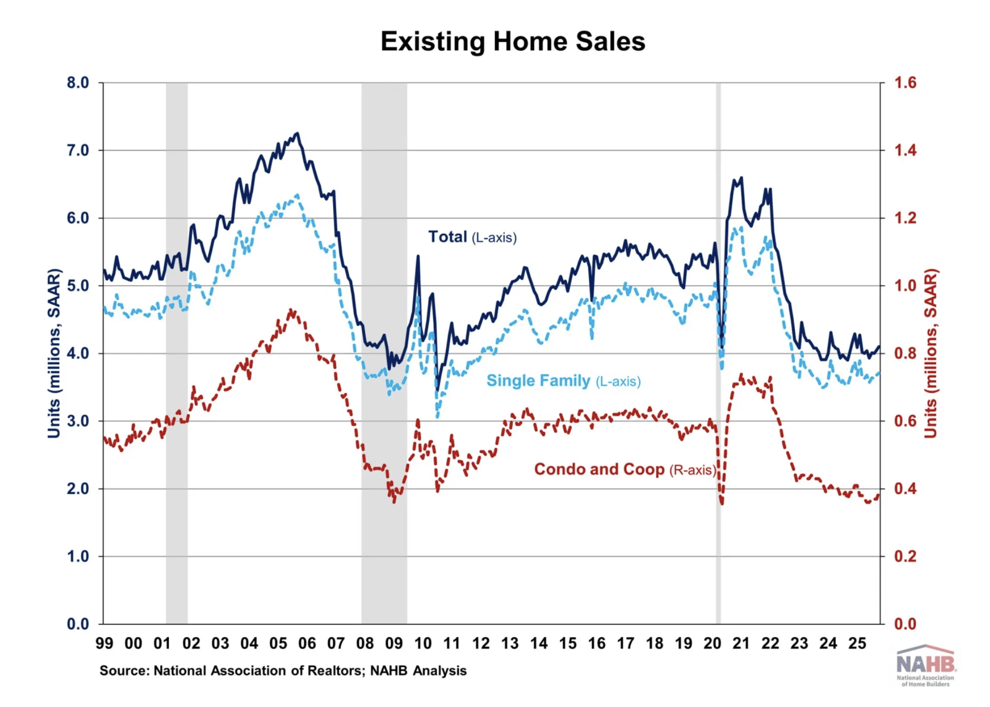 In October, existing home sales across all markets increased by 1.2%, this is a seasonally adjusted annual rate of 4.10 million. This is the highest level since February. Compared to 2024, sales were 1.7% higher.