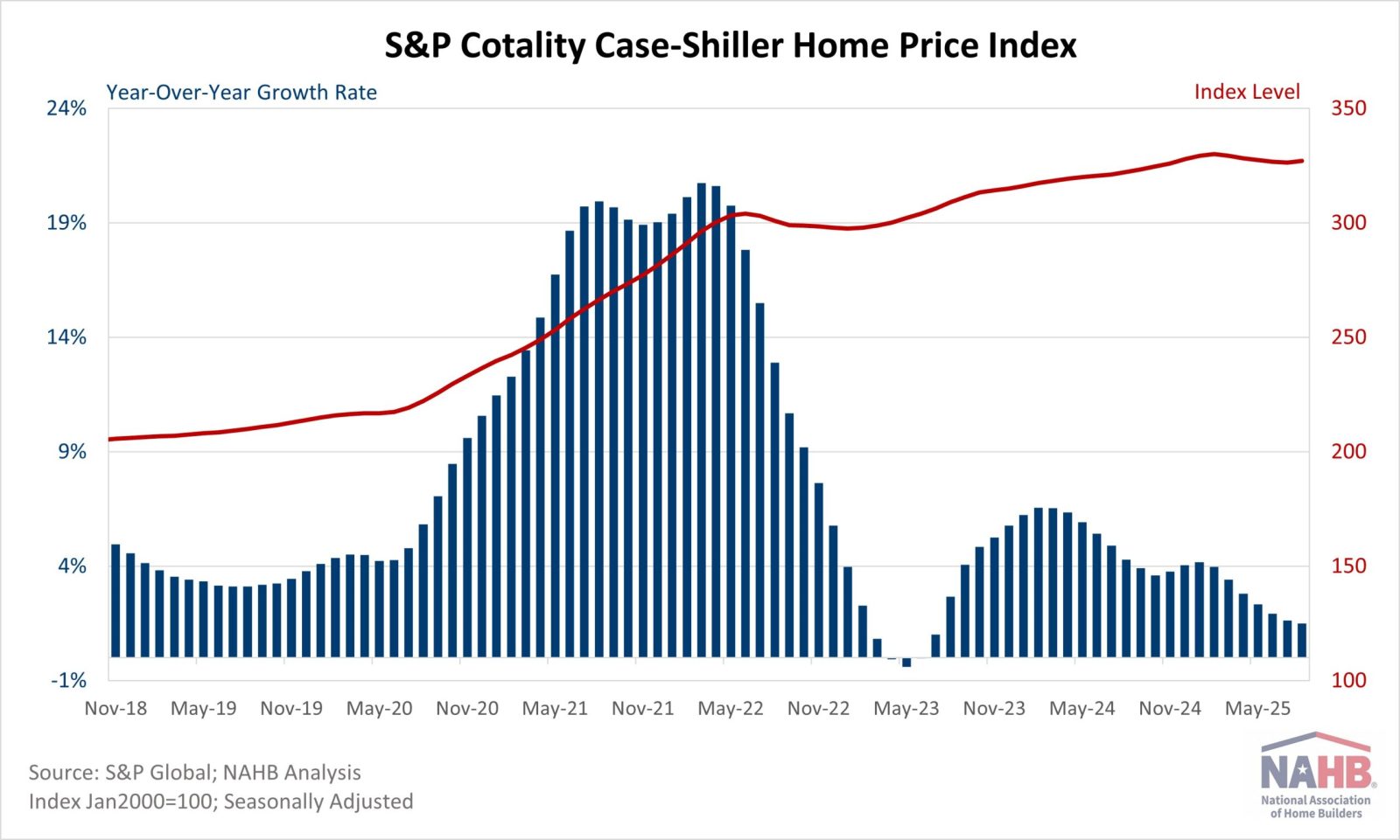 Research into home price growth shows at an annual rate of 1.51%. This is a staggering difference from the 6.5% rate in 2024. Additionally, it about half the rate of inflation. The National Association of Homebuilders (NAHB) and the S&P Cotality Case-Shiller Home Price Index, home price growth in August is the slowest in two years. “On a monthly basis, the index posted a modest increase from July, following five consecutive months of decline.” said NAHB manager of Economic Services Onnah Dereski.