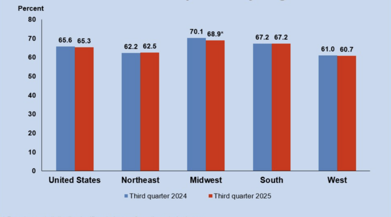 While this is a step in the right direction, there are still some signs that affordability issues persist. The homeowner vacancy rate of 1.2 percent was higher than the rate in the third quarter 2024 (1.0 percent) and higher than the rate in the second quarter 2025 (1.1 percent). Additionally, in the third quarter 2025, the median asking rent for vacant for rent units was $1,534. This rate of 65.3% is still significantly below the peak of 69.2% in 2004. Currently, it remains below the 25-year average rate of 66.3%.
