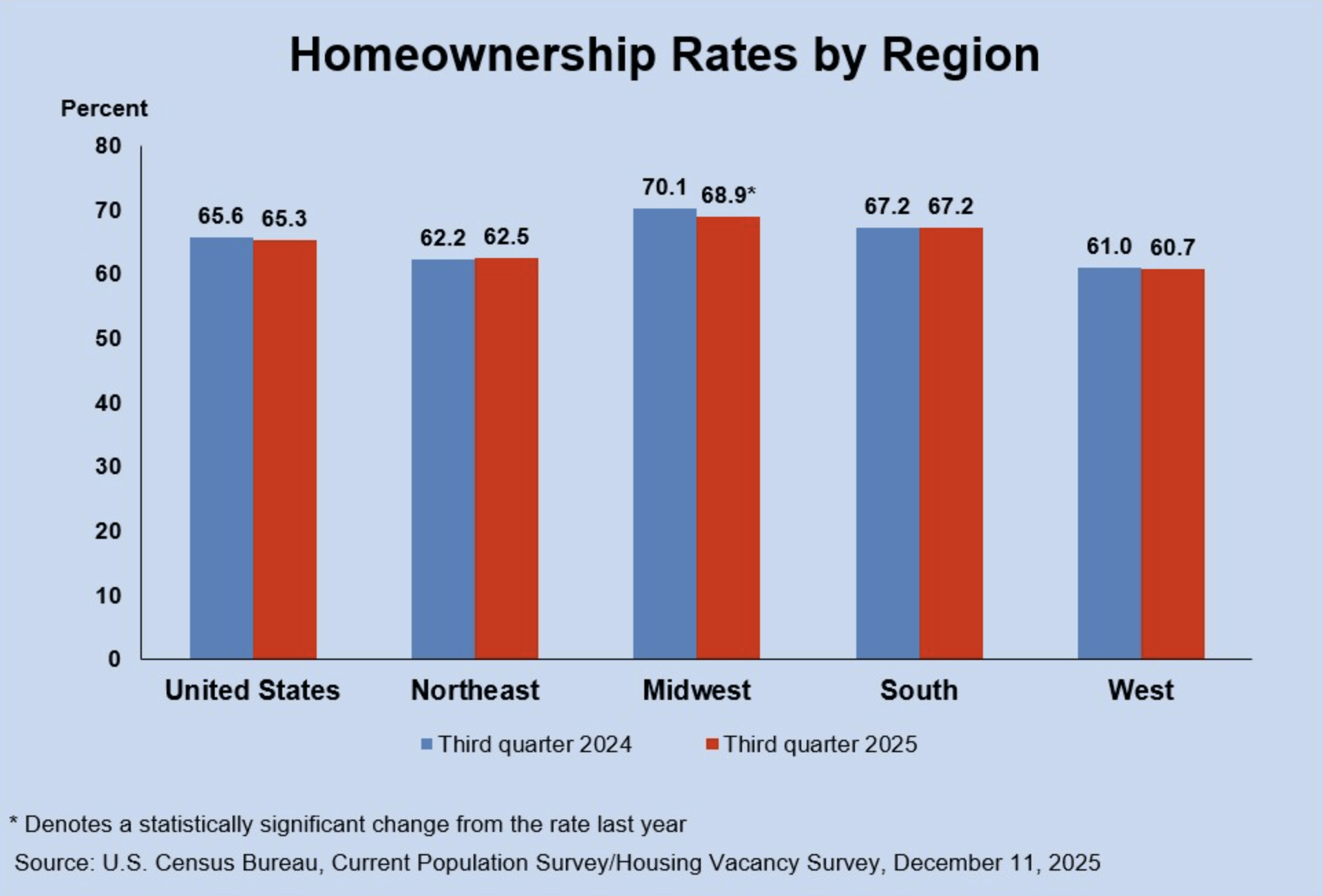 According to the Census’s Housing Vacancy Survey (HVS) of Q3 2025, the latest homeownership rate rose up to 65.3%. However this rate is not an anomaly from the third quarter 2024 rate (65.6 percent) nor the rate in the second quarter 2025 (65.0 percent).