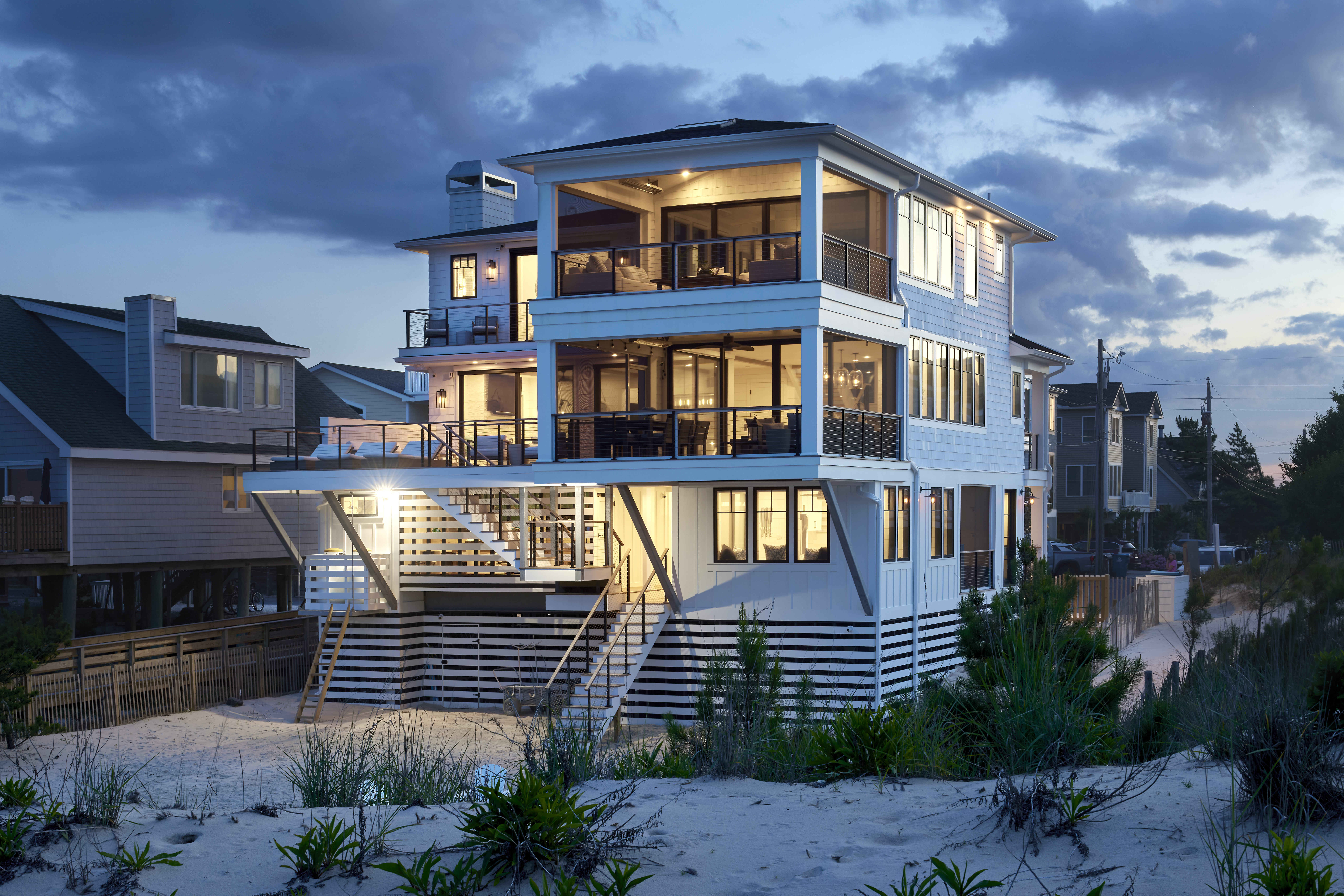 Marnie Custom Homes’ expertise in working with oceanfront properties equips them with the knowledge to navigate the complex guidelines when attempting a project like the Pura Vida. Constructing this home required overcoming requirements set by the Federal Emergency Management Agency and the Department of Natural Resources and Environmental Control, in addition to local town regulations.Utilizing steel framing to reinforce stability, the home was designed with weather-resistant materials with the capability of withstanding Category 3 hurricanes and 130 mph winds. Hurricane-rated windows and doors further complement the weatherized design, as well as tie-down systems that connect each floor with metal straps to maintain the integrity of the structure during extreme storms. The flood-resilient design is enhanced for proper drainage by elevated pilings and pressure-treated materials with permeable surfaces.
