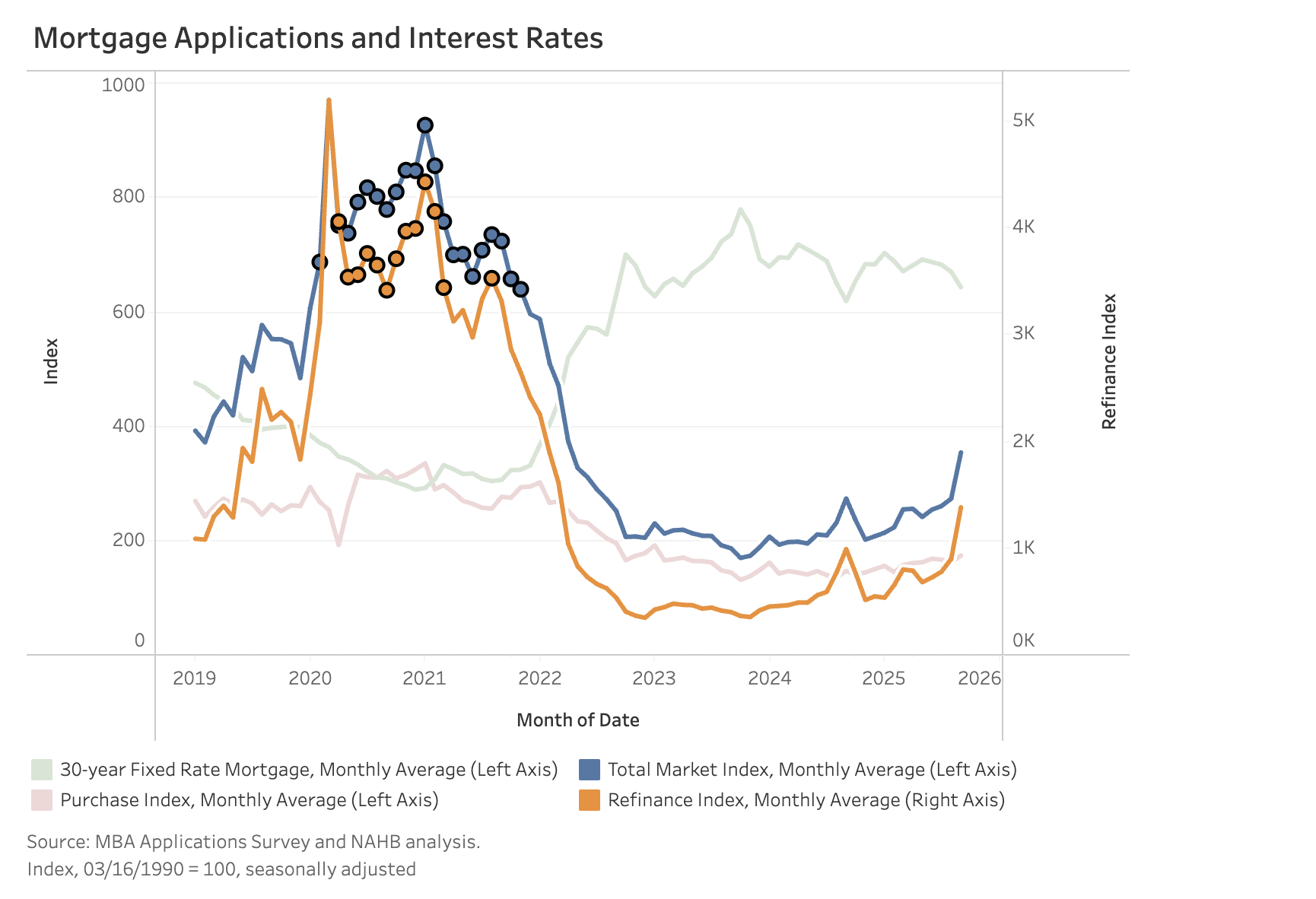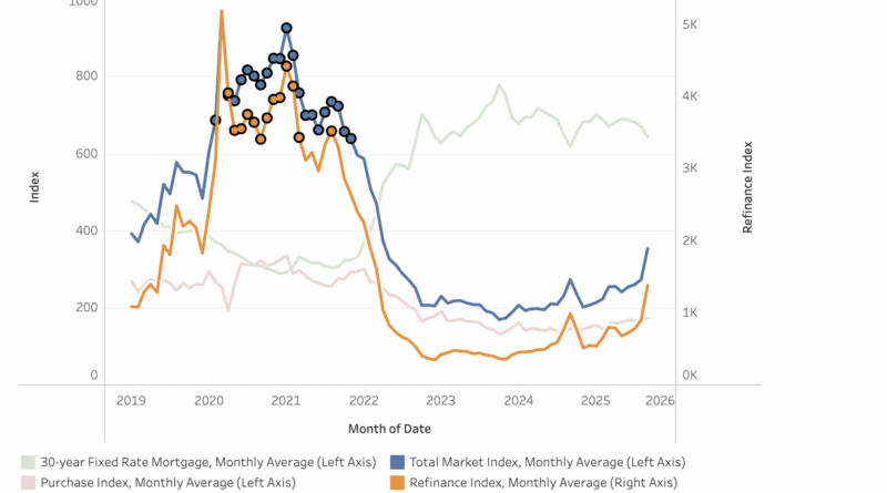Refinancing activity surged in September as mortgage rates dipped below 6.5% for the first time since October 2024, sparking the largest monthly increase in mortgage activity since the early pandemic years. The Mortgage Bankers Association’s Market Composite Index, which tracks total mortgage applications, rose 29.7% from August and nearly 30% year-over-year. With the average 30-year fixed mortgage rate falling 27 basis points to 6.42%, homeowners rushed to take advantage of the lower borrowing costs. Refinancing applications jumped 54.2%, while purchase applications climbed 7.7%, marking a broad-based rebound in housing market activity.