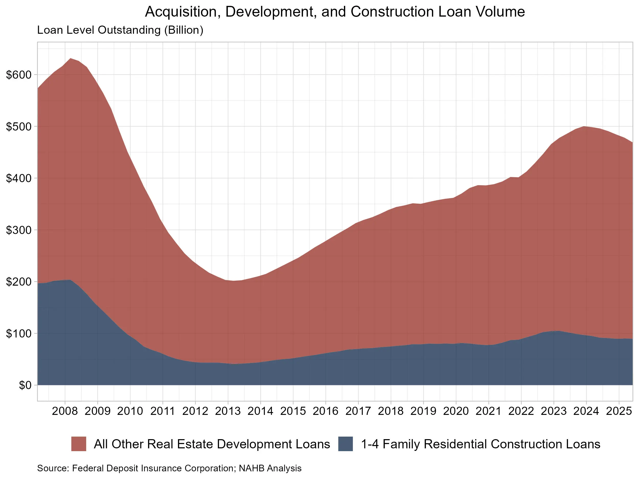 In the second quarter of 2025, builders continued to face tighter credit conditions as reported by the NAHB Land Acquisition, Development and Construction (AD&C) loan survey, with FDIC data showing a continued decline in outstanding loan volumes. The total stock of AD&C loans fell for the sixth consecutive quarter, dropping to $469.1 billion, down 5.3% from a year earlier. This decline was driven primarily by a decrease in other real estate development loans, which fell to $379.3 billion. Loans for 1-4 family residential construction and land development also declined slightly to $89.8 billion, down 2% annually and 0.3% from the prior quarter.