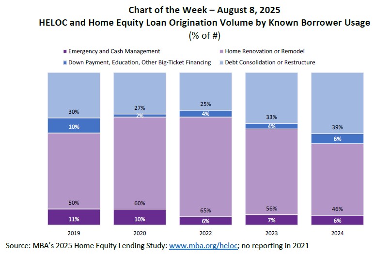 The Federal Reserve states that there is close to $35 trillion of homeowner equity in residential real estate. In 2024, approximately 39% of borrowers cited debt consolidation as the reason for applying for a HELOC or home equity loan, compared to 25% two years prior. Those borrowers who indicated home renovations as their reason for usage dropped to 46% of volume, compared to 6% in 2022. The remaining borrowers indicated emergency/cash management or big-ticket financing, such as for education or a down payment (bridge loan alternative, second homes and investment homes).