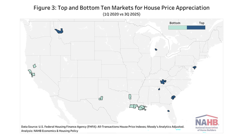 Since early 2020, U.S. home prices have risen sharply, up nearly 55% nationwide through the third quarter of 2025, though more than 200 metro areas have since dipped slightly from their post-pandemic peaks. Appreciation has varied widely: markets like Knoxville, TN, Atlantic City, NJ and Morristown, TN saw increases of 80% to nearly 90%, while places such as Shreveport, LA, several Louisiana metros and parts of California and Texas saw much smaller gains, ranging from about 18% to 27%.