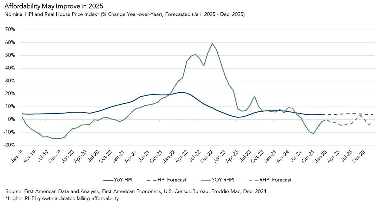 A resilient labor market is likely to keep wage growth positive, while nominal house price appreciation moderates. This dynamic could allow nominal wage growth to exceed house price growth. Slightly lower rates alongside positive wage growth could result in modest improvements in affordability.