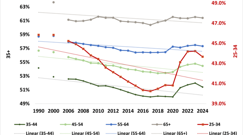 This low headship rate among young adults is tied in with cyclical economic constraints, including housing shortages, affordability pressures, labor market conditions, and credit tightening, long-term demographic and social trends. As a result, higher proportions of young adults are living with parents longer term or sharing housing with roommates, rather than buying their own home.